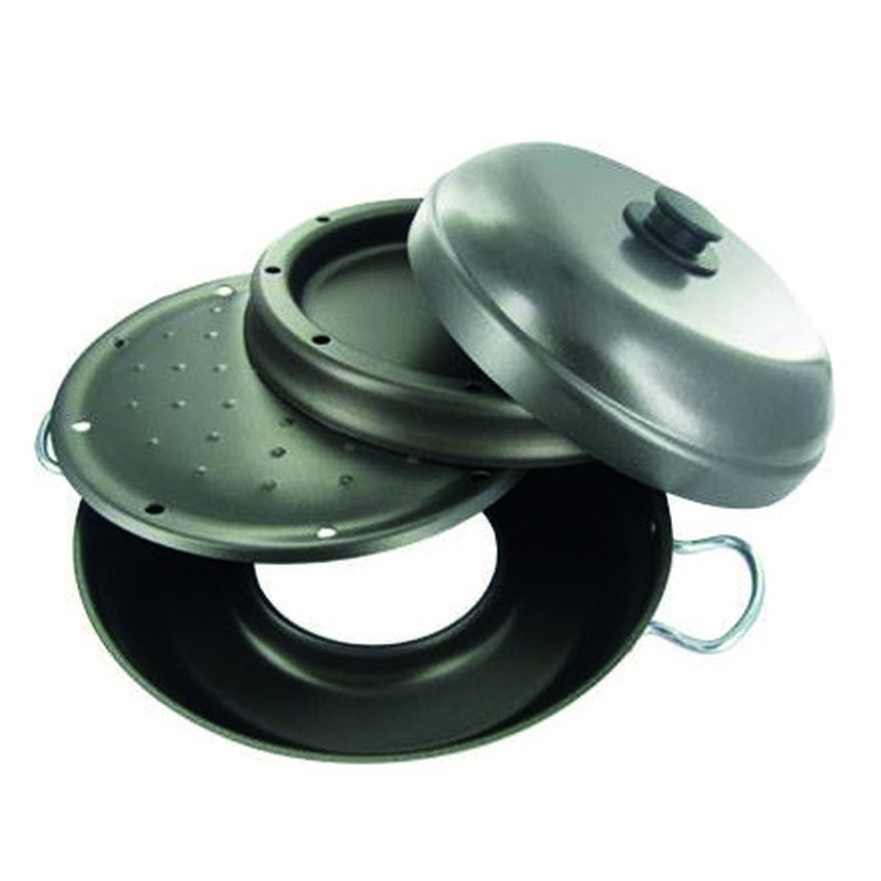 Composé de quatre éléments (barbecue de 32 cm, grill, "poêle four" et couvercle), il se pose facilement sur un réchaud à gaz pour cuisiner gâteaux, viandes, pizzas et légumes.